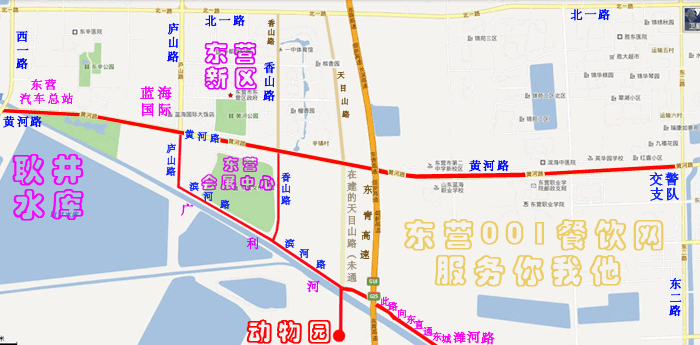 下圖是東營001餐飲網(wǎng)的記者給市民朋友們描繪的去東營動物園的行車路線圖(線路圖),標(biāo)有紅顏色的路段為前往東營動物園的指引道路: