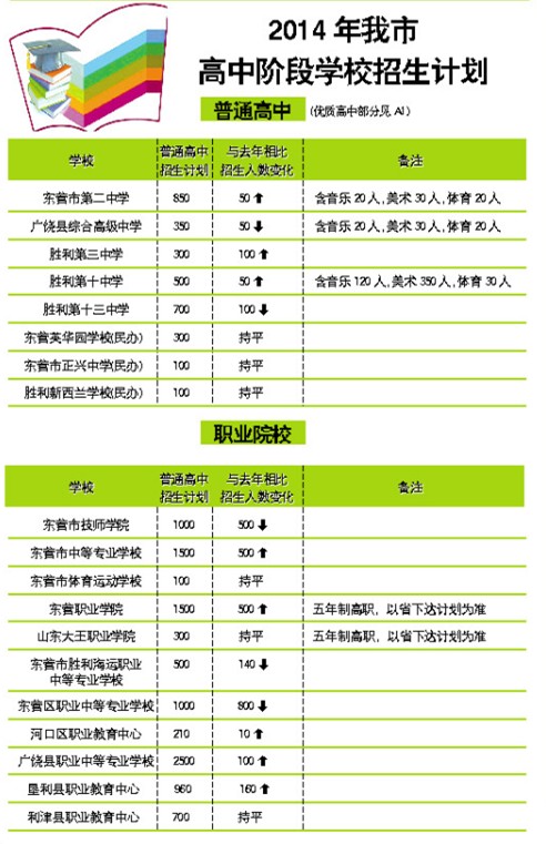 2月24日,東營市教育局向社會公布2014年東營市高中階段學校招生計劃,27所高中階段學校共招生24690人,其中16所普通高中計劃招生14420人,11所職業(yè)學校計劃招生10270人,全部招生總人數比去年下降800人。今年,勝利一中、市一中等8所優(yōu)質普通高中自主招生545人。