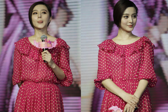 2011年11月5日和11月6日,著名國際影后范冰冰來到福州出席兩場商業(yè)活動(dòng)。這件彼得潘領(lǐng)紅色連衣裙穿與范爺白皙的皮膚真是相得益彰,可愛的設(shè)計(jì)和鮮艷的用色無不充滿了少女感。